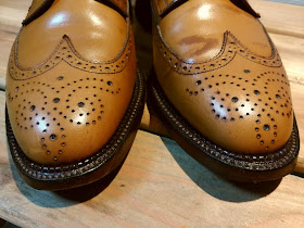 最近こういう汚れが目に付くのだけど、着用を繰り返しているとブラッシングとカラ拭きでは落ちない、今回ように跡でも残らないと一目では判らないような薄らとした汚れが蓄積されていくようだ。茶靴だからそれと気付くけれど、黒靴だとあまり気付かないかも。