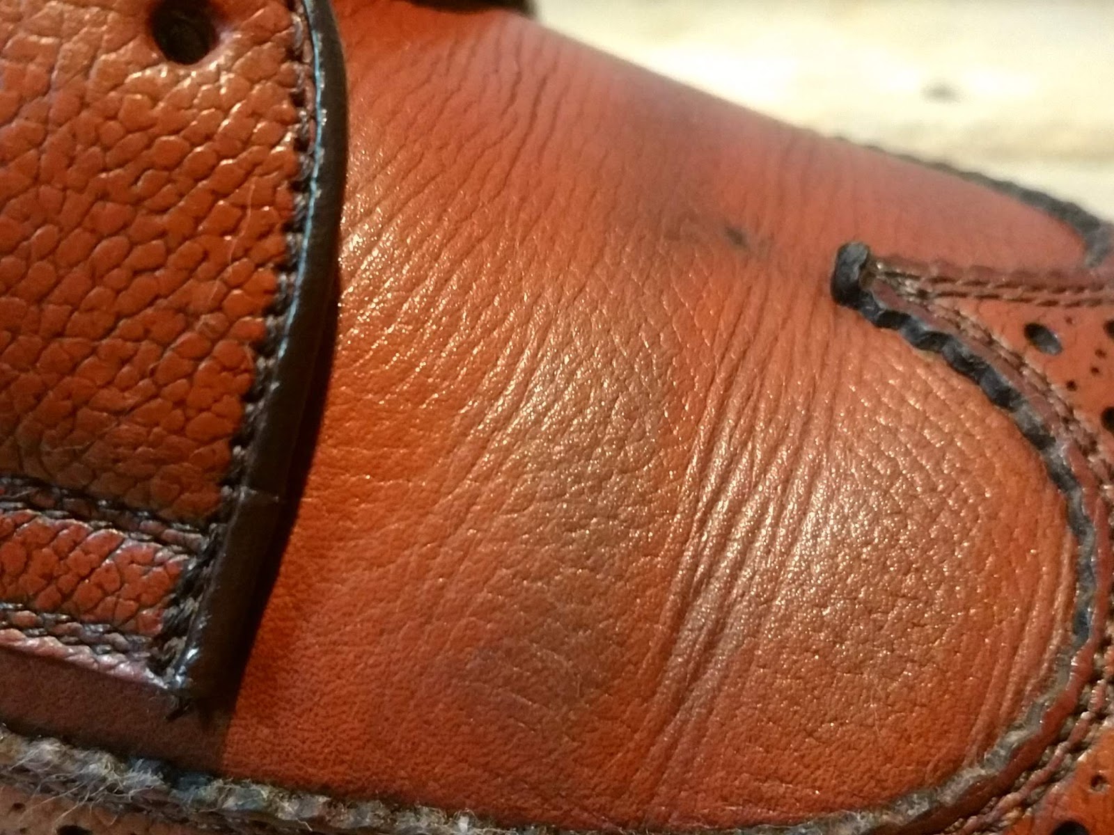 爪先のメダリオンが左右で大きく異なり、靴底もつま先も限界で、アッパーの状態も悪いから修理して履き続けることはしないけれど、製造から少なくとも30年近くを履きっぱなし、ほったらかしで過ごしてきたように見えるこの靴。ソールはまだオリジナルのままだから、30年という年月の割には大して履き込まれてはいないと思うのだけど、傷が入ってもつま先がシャクレても、私のような素人がちょっと手を入れてやればここまで復活するとはこの靴のポテンシャルを見せつけられたような気がする。